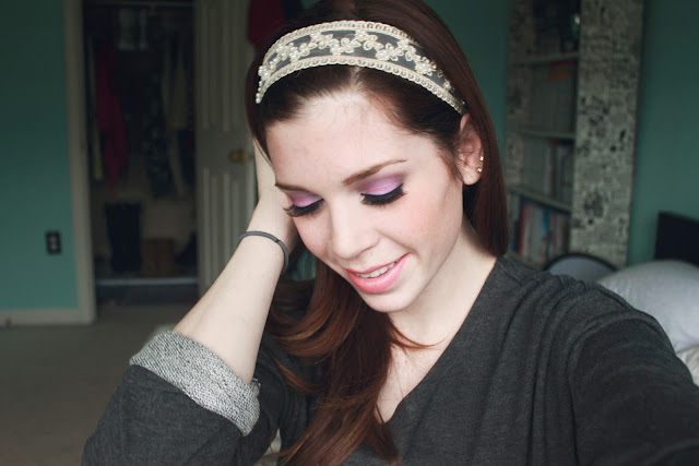 The basic gist of things is a lighter purple shade all over the lid followed by a white or champagne shadow in the inner 1/3 and a dark purple into the crease with a light brown transition color and the darker purple on your bottom lash line. Line your tightline and also line your upper lash line. Pop on some flirty false lashes on top and use a spunky purple mascara on the bottom ones. Do your usual facial routine and follow up with playfully pink cheeks and a soft pink lip.